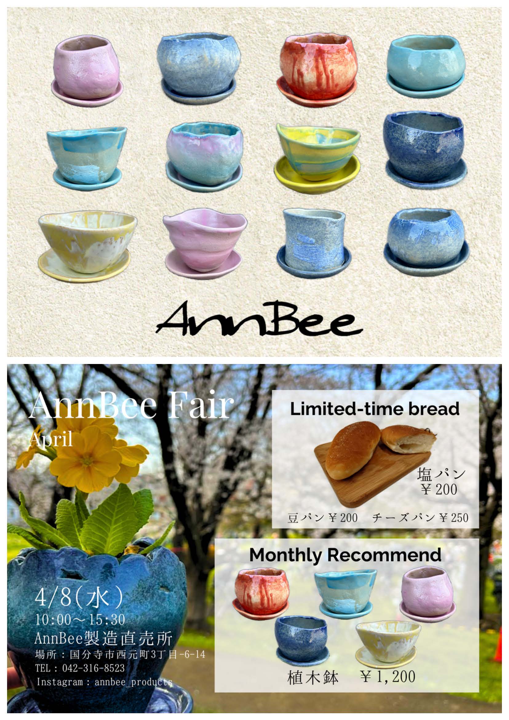 2026 年 3 月 15 日公開 桜まつり 2026.3.28桜まつり 多くの皆様にご来場頂き誠にありがとうございました。 こくぶんじ観光まちづくり協会様、また地域の皆様のご協力のもと無事に開催できたことに 心より感謝申し上げます。 明日は予定通り開催いたします! 2026.3.28 こくぶんじ観光まちづくり協会と一緒に 桜まつり開催! 皆さまのお越しをお待ちしております。 2026年 3月28日(土) 10:00~16:00 史跡武蔵国分寺跡 国分寺市西元町2-1.2 アクセス:JR西国分寺駅~徒歩15分 JR・西武線国分寺駅~徒歩18分 ※ステージタイムスケジュール、キッチンカー出店店舗等、 こちらから確認できます→チラシ裏面 4月AnnBeeフェア開催 4月8日(水) 10時~15時 AnnBeeフェア開催 2月AnnBeeフェア開催 2月6日(金) 10時~15時 AnnBeeフェア開催 11月13日(水)コレド日本橋 コレド日本橋にてAnnBee出店致します。 お菓子は、定番ドーナツ・こくべじドーナツ・カステラキューブ等販売致します。 お近くにお越しの際は、是非お立ち寄りください。