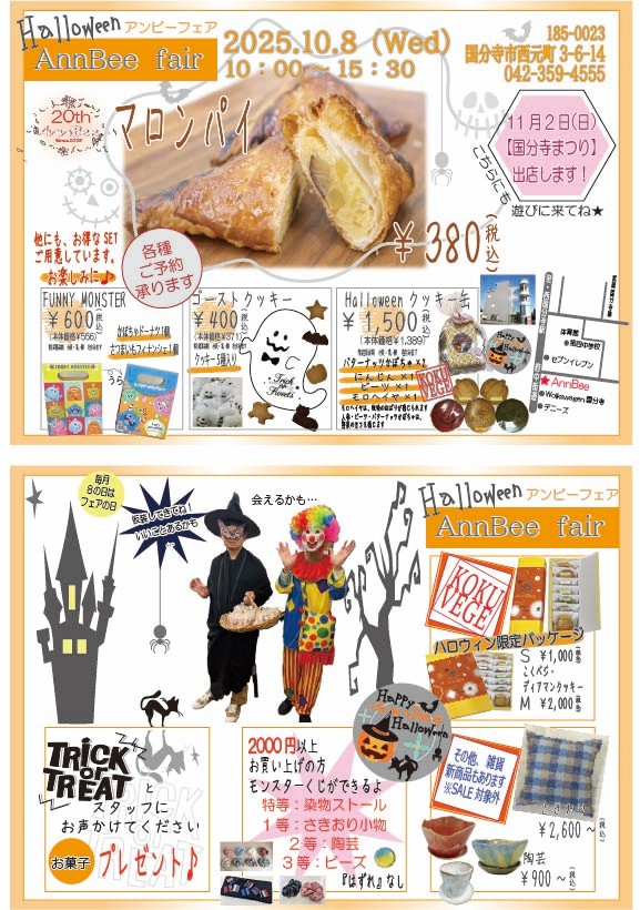 2025 年 10 月 14 日公開 イベントのお知らせ イベントのお知らせ 10月25日~26日 東京あじわいフェスタ (豊洲)にて商品販売いたします。 AnnBeeフェア開催予定 10月AnnBeeフェア開催 2025.10.8(水) 10:00~15:30 11月13日(水)コレド日本橋 コレド日本橋にてAnnBee出店致します。 お菓子は、定番ドーナツ・こくべじドーナツ・カステラキューブ等販売致します。 お近くにお越しの際は、是非お立ち寄りください。